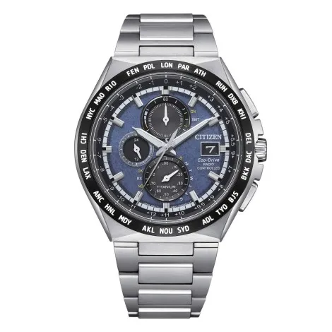Movimento al quarzo alimentato dal sistema Eco-Drive con riserva di carica da 6 a 10 mesi (a carica completa) con funzione risparmio energetico. Funzioni Radiocontrollato a cinque canali: ricezione segnale orario USA, Europa, Giappone, Cina. World timer per 26 città del mondo.